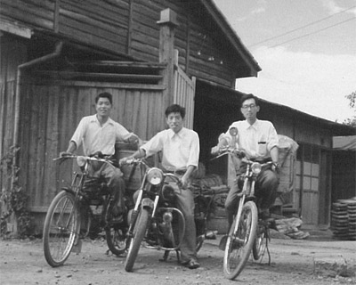 工場の前で配達に出かける3人です。 真中でバイクにまたがっているのが2代目の稔です。 まだこの当時は借家として借りていたので以前、石鹸工場だった 場所をそのまま使っていたようです。となりにあった掘立小屋を 住居にしていました。 3代目の滋も5歳までここで育ちました。工場は若干の改装をしながら昭和63年まで使っていました。